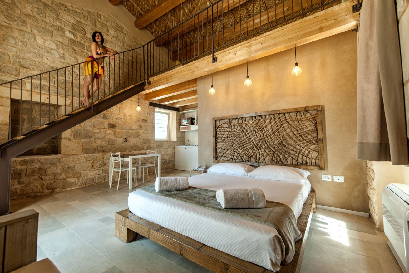 L'Appartamento Premium è ubicato all’interno del baglio, adiacente alla reception. La camera, una volta ""a carretteria"" può ospitare da 2 a 4 persone è su due livelli: al piano inferiore letto matrimoniale con testata etnica che si addice perfettamente alle originali mura in pietra, angolo cottura e bagno con doccia. Il piano superiore è composto da 2 letti singoli. E’ sicuramente la camera più spaziosa pronta ad ospitare un nucleo familiare.